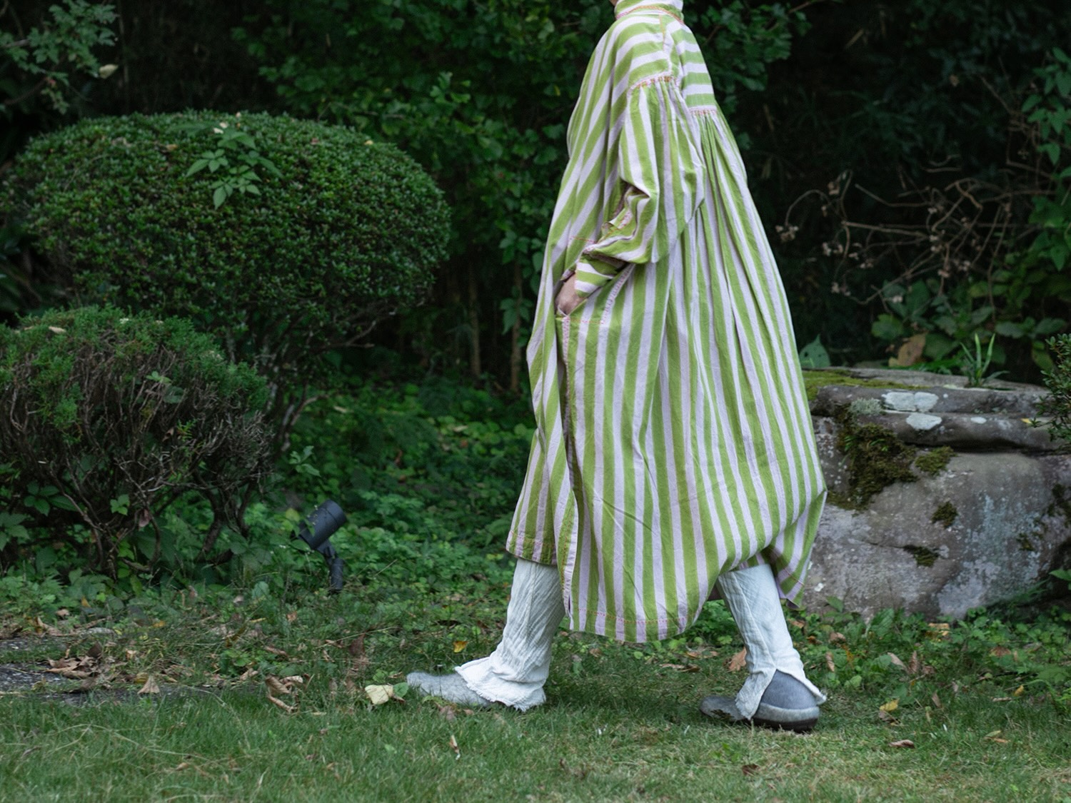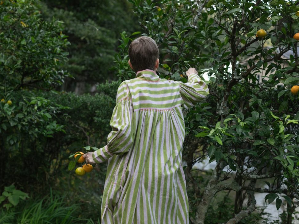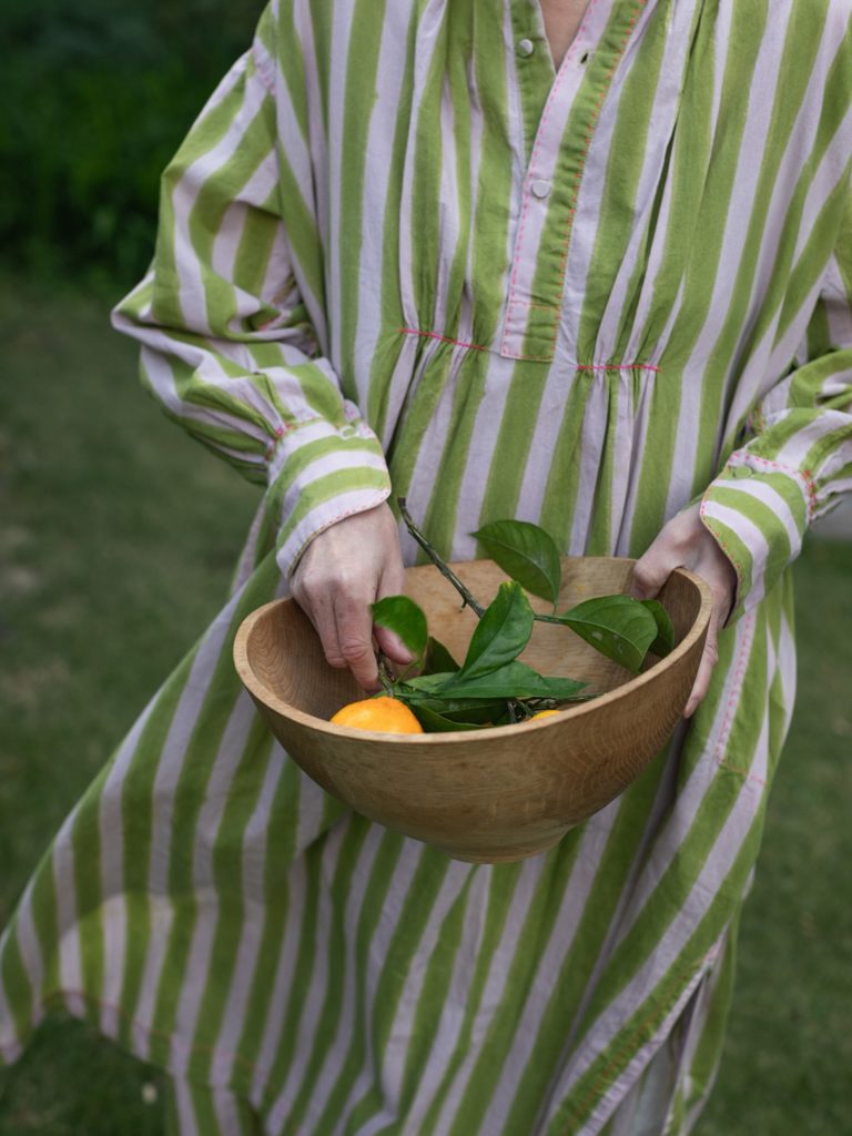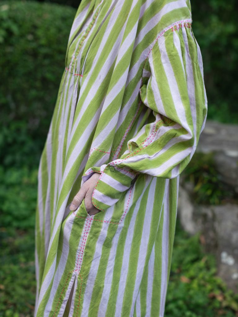 明るいモスグリーンとピンクのストライプ生地は、サンガネールの工房で製作をした