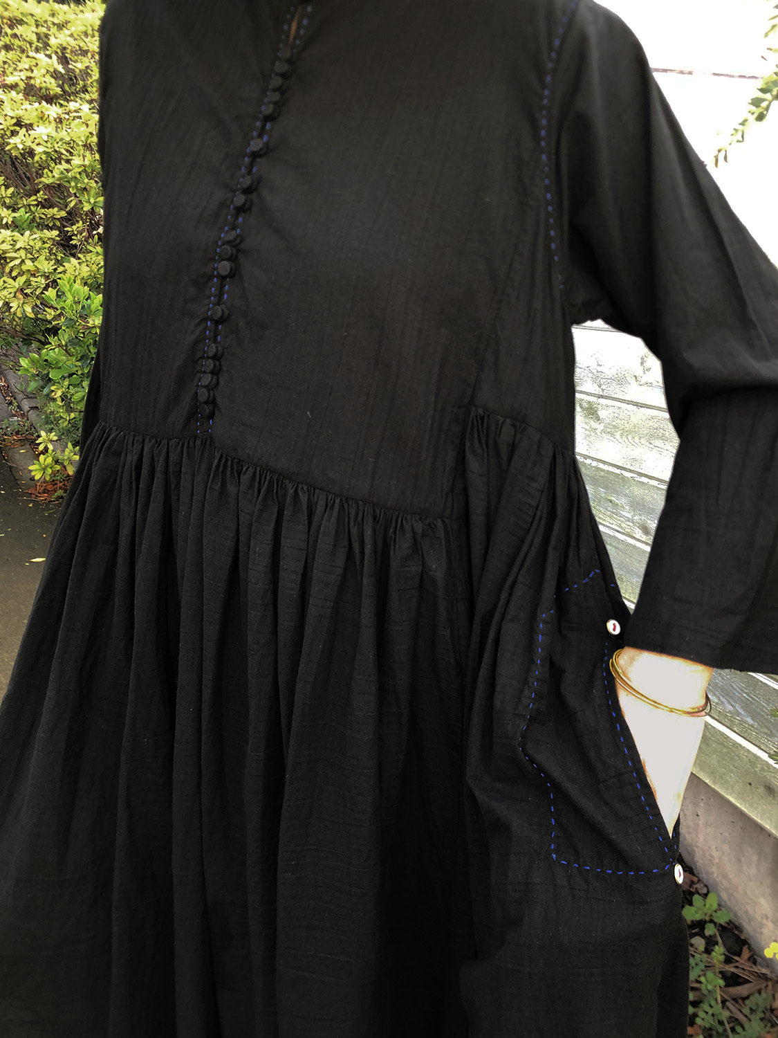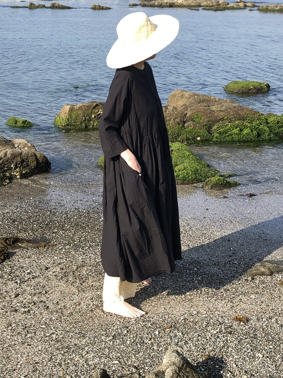 手紡ぎ手織りの軽やかに広がるギャザードレスです。
